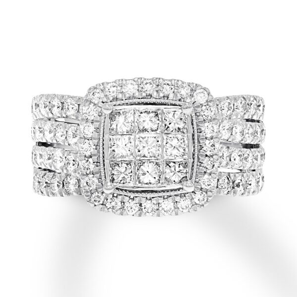 You are ready to spend your lives together, and you want to let the world know. This stunning engagement ring does just that with a frame of round diamonds surrounding three rows of princess-cut diamonds in the center. Awash in more dazzling round diamonds, a generous band of 10K white gold completes the look. The ring has a total diamond weight of 2 carats.
