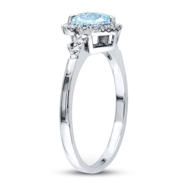 This beautiful ring for her showcases a rich heart-shaped aquamarine haloed by sparkling diamonds. Additional diamonds adorn the sides of the slender band. Crafted in sterling silver, the ring has a total diamond weight of 1/10 carat.