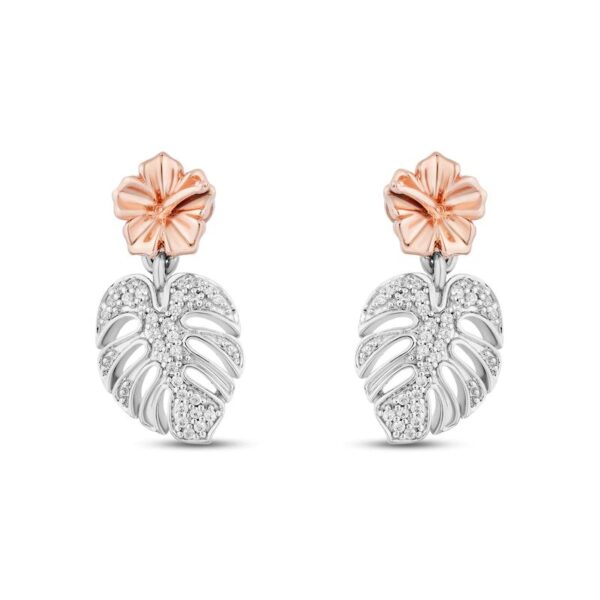 Featuring a tropical design, these earrings feature 10K rose gold hibiscus flowers shimmering on the posts while glittering round diamonds sparkle on the dangling leaves. The earrings have a total diamond weight of 1/10 carat and are secured with a friction back.