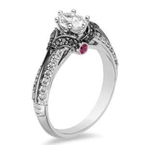 - Two rows of shimmering diamonds along the shank and two bezel-set bright red rubies under the gallery decorate this epic design.